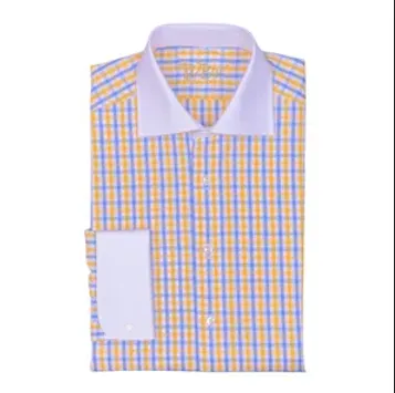 Custom Made 100% Cotton Yellow and Blue checkered pattern with white semi cutaway collar and white French Cuffs
