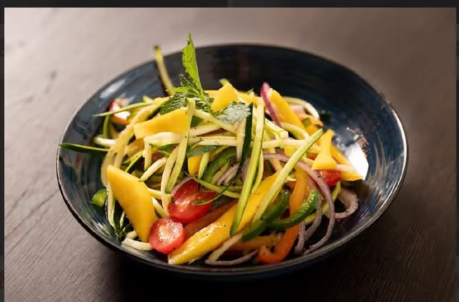 Fusion Mango Salad $18.00 Zucchini strings, tomatoes, red onions, mangoes, bell peppers, jalapeno, and mint. Plus small